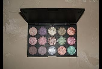 Aquí os enseño la paleta terminada. La mayoría son de pigmentos de Everyday Minerals, menos cuatro de la marca Monavé. Los de EDM se prensan muy bien, aunque he de comentar que los pigmentos con más destellos cuesta mucho más, porque si ampliáis la foto, algunas sombras ya se están rompiendo un poco.