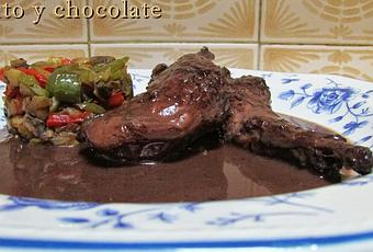 - Apartamos la cazuela del fuego y retiramos las paletillas de conejo para ligar la salsa con los 30 gramos de chocolate.