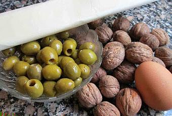 - Plancha de hojaldre (mejor rectangular).- Aceitunas verdes sin hueso 120 g.- Nueces 50 g.- Yema de huevo 1.