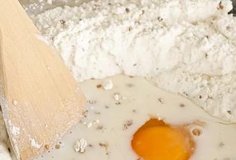- En un bowl colocar la harina, azúcar, levadura y semillas de anís. Mezclar un poco para incorporar y luego añadir la leche junto con el huevo y la esencia de vainilla.