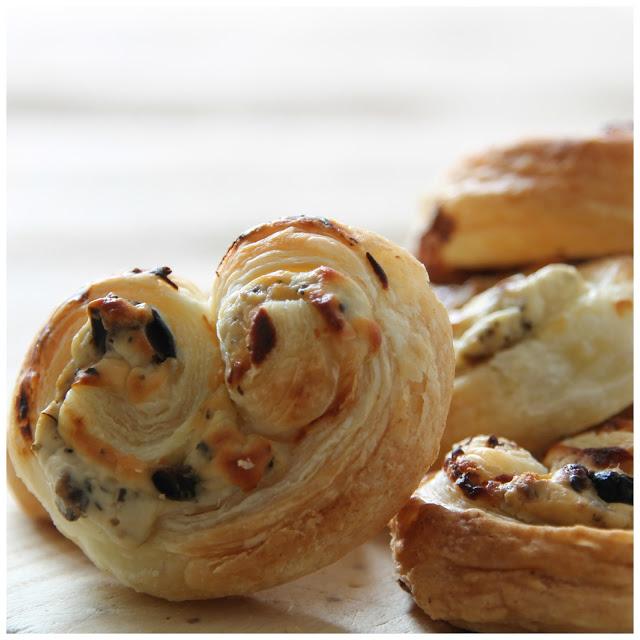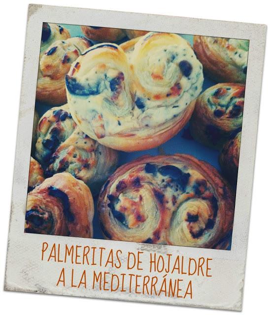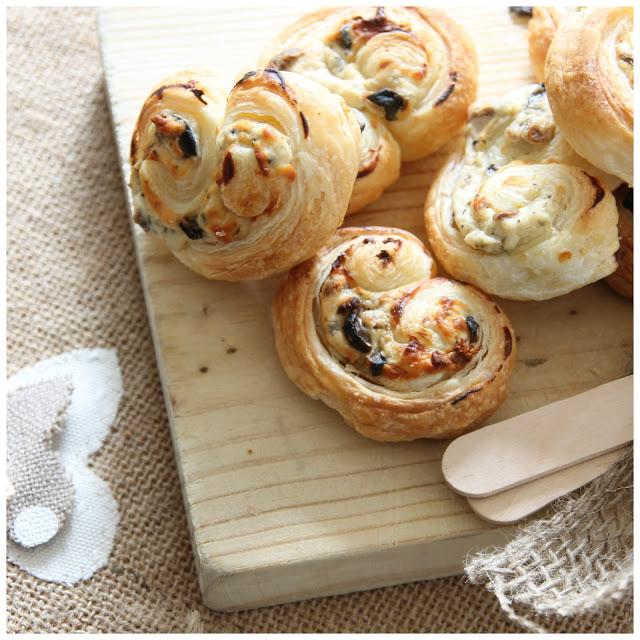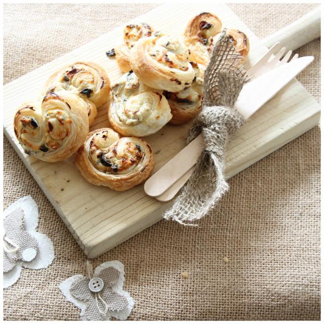 Hoy os traigo una receta que tanto puede ser un aperitivo caliente como solventaros una merienda. Se trata de una receta muy sencilla de hojaldre de la que podréis hacer tantas versiones como queráis... es sólo cuestión de imaginación. Estas tienen la ternura del queso y la fuerza mediterranea de las anchoas, las aceitunas, el ajo y la albahaca. --- Todays' recipe is very easy to do and can be both an appetizer or a snak . You could do as many versions as you want. Just need a little imagination. These palmiers have the tenderness of cheese and the Mediterranean strenght of anchovies, olives, garlic and basil.