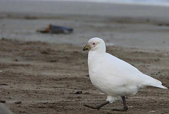 En la lobería y el puerto hay desperdicios que las palomas antárticas aprovechan, que pueden ser restos de piel, ectoparásitos, restos de peces y materia fecal; estas aves no se destacan por su delicadeza a la hora de alimentarse. Se las ve deambular entre los lobos marinos que yacen descansado plácidamente en la pequeña playa de la dársena, casi inmutables ante la presencia de las aves.