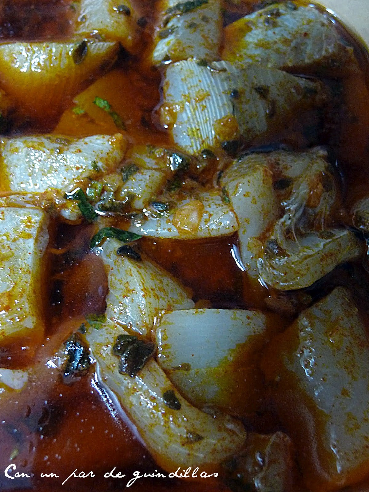 2.- En un mortero machacamos los dientes de ajo bien triturados, añadimos el orégano, perejil pimentón y el aceite, mezclamos muy bien y echamos este adobo al pescado, removemos procurando quede bien impregnado, tapamos y dejamos en maceración 24 horas (está mejor de un día para otro)