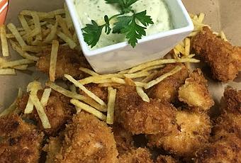 A los niños les encanta rebozado, en tiras o fingers. Yo lo he llamado Palomitas pues son trozos redonditos y el empanado es más crujiente al llevar Panko.