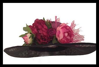Es la pamela Pegasus, está realizada con una base de sinamay en negro, pero lo más impresionante de esta pamela son las flores con las que la hemos adornado.