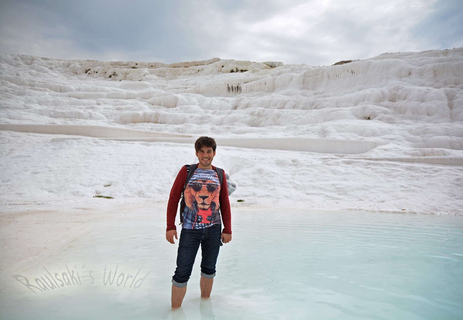 Hace milenios, hubo terremotos en esta zona que ocasionaron que afloraran aguas termales del subsuelo.Esta aguas estaban cargadas con una serie de minerales que con el tiempo fueron formando travertino (un tipo de roca sedimentaria) y piedra caliza de color blanco.El resultado es alunizante, fijaros que bañeras artificiales:Antes de ser declarado Patrimonio de la Humanidad, los turistas insensatos se lavaban incluso con jabón dentro de los travertinos, y cantidad de hoteles se construyeron sobre la zona, con lo que la zona se dañó considerablemente y muchas pozas de travertino se secaron.Hoy en día, después de pasar la barrera para entrar ( 25 TL) te hacen descalzarte para caminar por el travertino sin dañarlo. (llevar una mochila con una bolsa para meter el calzado dentro)Aunque haga frío, no os preocupéis porque por el travertino corre agua calentita, así que puedes ir caminando descalzo con los pies calentitos :-)A medida que vas subiendo, hay varias piscinas con aguas termales para darte un baño si lo deseas. Estas piscinas se han creado para que la gente no se meta en las pozas naturales y protegerlas.Cuando llegamos a la parte de arriba, me llevé una gran decepción: ¡ Las terrazas naturales estaban secas!! Por lo que vi, han canalizado el agua termal que mana del suelo. Ahora el agua corre por una acequia para que los travertinos recuperen el blanco original estando al sol.Una vez en lo alto de la colina, se puede visitar las ruinas de la ciudad romana que construyeron aquí hace 2000 años: HIERÁPOLIS