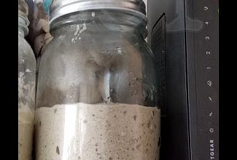 Dejamos refrescar entre 4 y 6 horas, hasta que doble, o incluso triplique, el volumen. Con esto tendremos 450 gr. de MM, 50 de los cuales guardaremos en un tarro en el frigo y el resto será lo que utilicemos para nuestro pan.