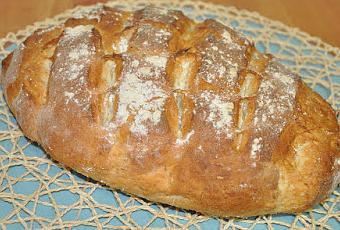 Agregar los demás ingredientes e ir pesándolos, tapar. Programar 2,50 mint. / Espiga / Amasar Cuando acabe , espolvorear la mesa de trabajo con harina y darle un amasado y la forma deseada. Colocar en la bandeja del horno forrada con papel sulfurizado(papel de horno). Dejar reposar hasta que coja volumen, espolvorear con un poco de harina. Hornear a 220º unos 40 mint. en la balda mitad del horno. Dejar enfriar en una rejilla.