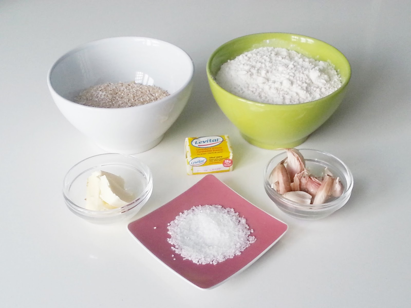 230 gr de harina de fuerza80 gr de copos de avena175 gr de agua caliente20 gr de mantequilla15 gr de levadura fresca 1 cucharadita de sal30 gr de ajo2 o 3 cucharaditas de perejil picado (opcional)
