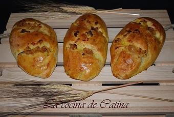 Desgasificamos ligeramente y lo cortamos en tres piezas del mismo tamaño; Le damos forma alargada, sacando punta en los extremos. Los colocamos en una bandeja de horno cubierta con papel sulfurizado, cubrimos con un paño y dejamos levar hasta que doblen su volumen (aproximadamente una hora más).Precalentamos el horno a 215 grados.Batimos el otro huevo y pintamos la superficie de los tres panecillos, hacemos unas aberturas en cada pan y la rellenamos con el resto de la cebolla, repartiendola entre los tres panes.