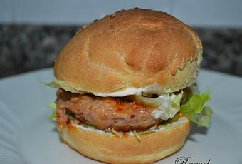 Partir el pan en dos untar ligeramente con mayonesa, poner lechuga y la hamburguesa encima y volver a tapar con el pan.