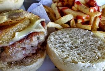 * Abrimos los panes: ponemos un poco de ketchup, la hamburguesa, dos lonchas de queso, la manzana frita y un poco de mostaza de Dijón.