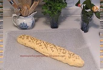 Dar forma de barra de pan con unos cortes.Introducir en horno de aire a 50º durante 30m. (tiene que doblar el volúmen)Si el horno no es de aire hay que ponerle un vaso de agua.Pasados los 30m, sin abrirlo, subir la temperatura a 225º y cocerlo 40 minutos más.