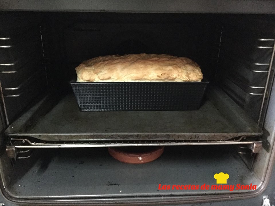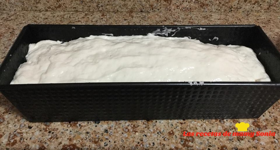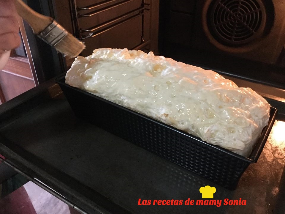 Pincelamos las paredes y la base del "molde pan" ( es un molde tipo plum cake antihaderente, con unas medidas de 31 cm de largo x 15 cm x 10,5 cm de profundo), con un poco de aceite de oliva. Ponemos la masa en el molde engrasado, y lo estiramos con la ayuda de una paleta o cuchara de silicona humedecida en agua caliente.