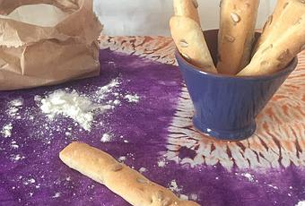 - Por último, precalentamos el horno a 220ºC con un cuenco de agua en la parte inferior para que se cree humedad, introducimos la bandeja con los palitos de pan y lo dejamos hornear durante unos 10 min o hasta que se doren un poquito. Dejamos que se enfríen y ¡¡YA ESTÁN LISTOS PARA TOMAR!!