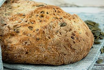 - Pincelamos todo el pan con aceite de oliva, incorporamos más semillas en la superficie, le hacemos unos cortes y lo llevamos al horno en un recipiente que habremos enharinado. Es importante que tapemos el recipiente, ya sea con una tapa o con papel de plata. Yo utilicé una fuente de cristal y la tapé con otro recipiente similar, también de cristal (ingeniería en la cocina 😀)