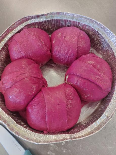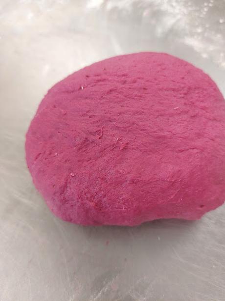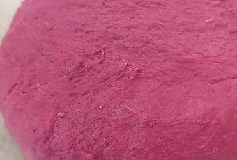 Preparación: En un bol poner la harina, el azúcar, la leche, el puré de remolacha y la levadura fresca.Amasar bien y cuando esté amasado, añadir la mantequilla y la sal y volver a amasar, hasta que esta fina y ligeramente elástica.