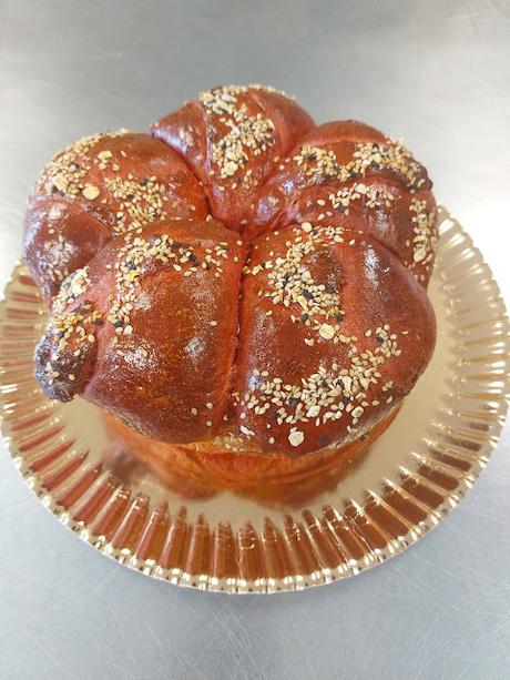 Dejar reposar un par de horas a temperatura ambiente o hasta el día siguiente en la nevera que es como lo hago siempre y se obtienen muy buenos resultados.Pasado el tiempo de reposo, dividir la masa en seis porciones iguales, bolear y reposar para que pierda la fuerza. Una de las bolas, estirarla para cubrir elfondo del molde que previamente habremos engrasado con spray o aceite.Una vez forrada toda la base del molde, dar cinco cortes, Colocar las otras cinco bolas y envolver cada bola tirando de las puntas que nos habrán quedado al haber cortado la base. Pincelar con huevo batido y dejar fermentar poco más o menos una horaCuando esté fermentado y con mucho cuidado volver a pincelar con huevo batido y decorar con semillas al gustoCocer a 200º C entre 20 o 30 minutos, dependiendo del horno.Una vez hecho sacar del horno y dejar reposar unos momentos para luego desmoldar y dejar que enfríe por completo