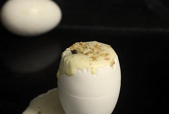 Sirve en estos huevos o en un ramequín o lo que tengas, bate el sifón hacia abajo, añade el panko crujiente, el queso y la trufa rallada.Hay que tomarlo en el momento, porque se baja en nada. Como te he comentado a mi me encanta, no te creas a ellos también se les licua, jajajajGracias BeaC por lo que ya sabes, espero que te guste, bsss