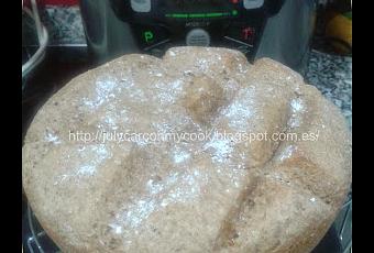 Poner todos los ingredientes en el mismo orden de la receta en la cubeta de la panificadora (el azúcar en una esquina y la sal en otra esquina), programa nº 6 (amasado con levado) cuando pita la 1º vez la panificadora, sacar la masa, amasar un poco, darle forma redonda, hacer unos cortes y meter en la cubeta de la GM E, tapar y dejar doblar su volumen (aproxi. 1h) cuando haya levado, programar menú horno, 20 minutos, con válvula abierta, abrir la olla y si tenéis la tapa horno, poner 10 minutos 175º, si no la tenéis dar la vuelta al pan y menú horno 10 minutos, tapar y válvula abierta, sacar y dejar enfriar sobre una rejilla