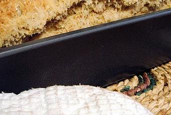 Ponemos la masa en una bandeja de horno o en un molde para pan,que habremos engrasado y enharinado previamente,y le hacemos una cruz o rayas en la parte superior del pan, para que forme corteza(cuanto mas honda las hagamos mas corteza tendrá el pan). Lo metemos al horno precalentado a 190º durante 40 minutos a media altura. Cuando este listo lo dejaremos enfriar antes de cortarlo.