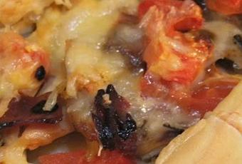Rellenamos nuestro pan, primero ponemos el pollo, luego el bacon, el tomate y por ultimo queso rallado.