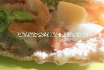 Mezclamos las verduras con el salmón y el queso. Seguidamente rellenamos los dos panes con la mezcla de verduras y salmón.