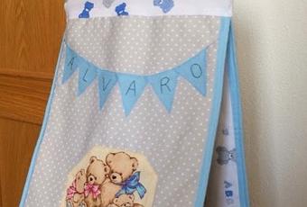 Álvaro ya tiene su pañalera de ositos terminada. Las medidas son 35 cm de ancho, que es lo que miden las perchas pequeñas, y la parte de lunares es el largo de la tela 1,10 metros. Un bonito y práctico detalle, que además sirve para decorar su habitación.