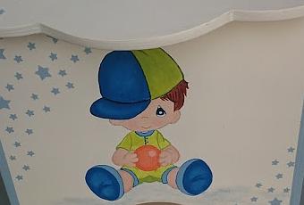 Raquel contacto conmigo pues quería que le hiciera una pañalera para un regalo. Ella había recibido una en su momento y le parecía muy práctica... Nos pusimos a buscar un motivo y un diseño que le gustara y los colores, el diseño en definitiva... He utilizado una plantilla para hacer las estrellas y el resto está pintado a mano.... Así quedo....