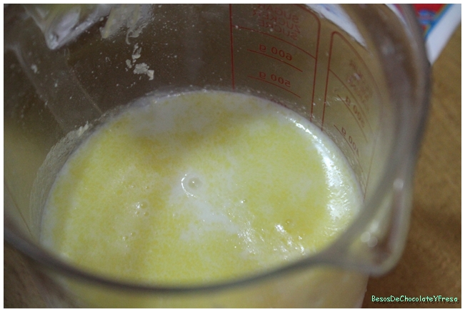 Comenzamos primero vertiendo 200 ml de leche en un recipiente y trocitos de mantequilla pequeños, los dos huevos, harina y una pizca de sal y azúcar.