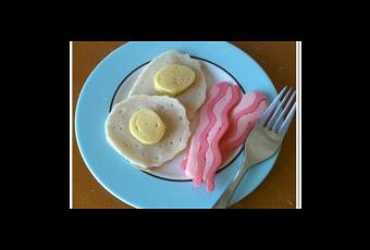 Nos encanta esta fiel reproducción de un par de huevos fritos con bacon, genial.