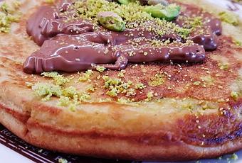 2.- En una sartén antiadherente ponemos una cuchara de café de mantequilla. Calentamos la mantequilla. Con un cucharón añadimos la masa de los pancakes de pistachos. Hacemos la masa unos minutos por cada lado sin llegar a quemarla. Repetimos la operación hasta acabar con toda la masa. Servimos los pancakes con la crema de cacao y unos trocitos de pistachos por encima.