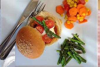 Esta receta viene en parte de mi tablero de Algo saladito para variar. Son unos pastelitos de cangrejo a los que le he dado forma de hamburguesa y a los que he acompañado de unos panecillos increíbles. La verdad es que estaban muy buenos ambas cosas y que a los peques les encantaron. Tengo suerte de que a mis peques les guste casi todo y el pescado y el marisco entran dentro de ese todo. Es más, se pirran por ellos. La recetita de los pastelitos de cangrejo es muy, muy sencilla y se puede hacer el día antes, con lo cual, eso que hemos adelantado. Los panecillos también podemos hacerlos antes pero yo prefiero hacerlos en el día para tomarlos recién hechos. Las especias que llevan los pastelitos de cangrejo son unas cuantas, lo que se llama en inglés "blackened seasoning" que podemos decir que es un aderezo formado por diferentes especias y hierbas aromáticas que hace que la carne o el pescado forme una costra negra cuando se lo echamos encima y lo ponemos a la plancha. Esta es la primera vez que he sabido de él y la verdad es que está bastante bueno. Como veis, he acompañado mi plato con un poco de ensalada de maíz, zanahoria y tomatitos cherry y unos espárragos vuelta y vuelta en la sartén. A la hamburguesa le eché un poco de salsa ali-oli pero podéis aderezarla como queráis. Seguro que está buenísima.
