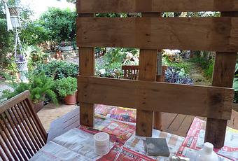 Es una especie de jardinera enorme, también de palet. Madre mia para meterla en el coche¡ Menos mal que iba con uno de mis hijos y me ayudó. Después de cargarla, la puerta del coche ni cerraba, pero aún así arranqué y así que me fuí a casa ( está bastante cerca ehhh) después de dejarlo a él en el trabajo.Se me ocurre otra cosa para hacer con esto pero no sé yo si será mucho trabajo. Imaginad ponerle una tapa con bisagras por detrás y hacer un banco-baúl. Quedaría genial pero no creo que le pueda encontrar "hueco" en casa.....