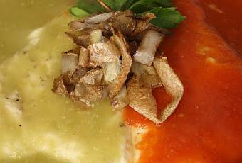 - Con cuidado se baña la mitad del plato y queso con salsa roja y la otra mitad con salsa verde.