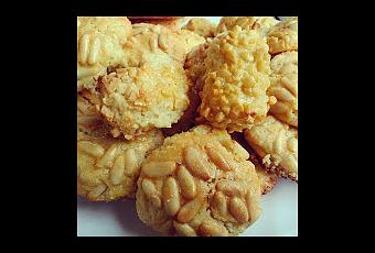 Piñones, almendra y avellana: Batimos un huevo y con la ayuda de un pincel vamos pintando las porciones de masa para que los piñones, la almendra a trocitos o la avellana se enganchen bien. Después, los pincelamos también por encima.