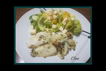 -Un filete de panga-2 dientes de ajo picados-Perejil-1 cogollo de Tudela limpio y troceado-2 rodajas de piña troceadas-Cubiquesos de cabra-Aceite-Vinagre-Sal