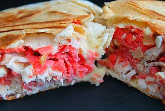 Cogemos el pan libanés y lo abrimos por la mitad sin llegar al final. A continuación lo rellenamos de pollo, mortadela con queso y queso de lonchas.