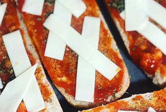 Hice de dos variedades... pero llevan la misma base: Tomate. Oregano Ajo en polvo Lonchas de queso en trocitos. El que más nos gustó a Julián y a mí: Cebolla, Atún, Queso Azul El que más le gustó a Alejandra: Bacon Ambas variedades llevan por encima mezcla de quesos