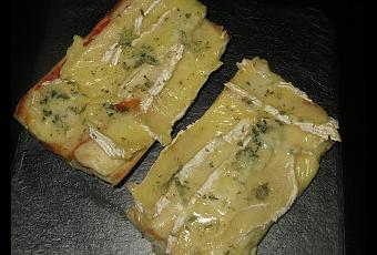 Elaboración:Cortamos las rebanadas del pan que hayamos elegido como si fueras a realizar un bocadillo, las untamos con un poco de tomate frito. Ponemos las lonchas de queso Cheddar y Emmental y arriba unos tacos del queso Camembert, yo es el que más utilizó porque me encanta este queso como se funde en el horno y terminamos con un poco de queso azul en taquitos por encima, en este caso Gorgonzola. No os aconsejo que utilicéis mucho de este último queso, ya que como tiene mucho sabor os puede comer el resto de los sabores.