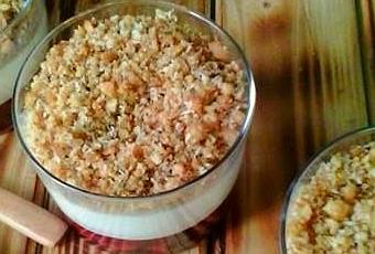 Panna cotta de compota de frambuesa y crumble de galletas con coco rallado