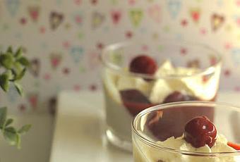 INGREDIENTES: ( para 4 personas)200ml de leche entera.300ml de nata.4 hojas de gelatina neutra.4 cucharadas soperas de azúcar.1 vaina de vainilla.Mermelada de cerezas.PREPARACIÓN:Poner las hojas de gelatina a remojo en agua fría.Poner en un cazo al fuego la nata y la leche, cuando hierva añadimos el azúcar y el interior de la vainilla raspando con un cuchillo y removemos.Retiramos el cazo del fuego, escurrimos la gelatina y la añadimos a la nata y la leche removiendo para que se mezcle bien.La ponemos en los vasitos y la introducimos en el frigorífico unas 3 horas.Yo he puesto el vaso ligeramente inclinado para que la gelatina solidifique y quede de esa forma. Lo he hecho con una bandeja de cupcakes, he apoyado los vasos inclinando aprovechando los huecos de la bandeja.Pasadas las tres horas en el frigorífico ponemos la mermelada de cerezas y para decorar he puesto un poco de nata en spray y otra cereza.