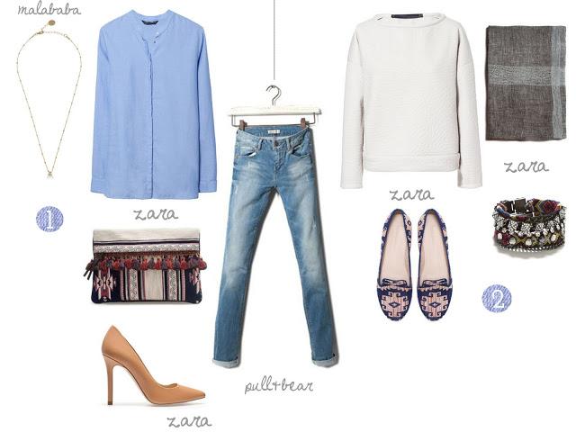 La opción más "formal" con una blusa en tono azul (es de la nueva colección de Zara y sienta genial, os la recomiendo) y salones; o podemos llevarlos con sudadera y slippers étnicos. Ya le he dado un poco la vuelta a mis vaqueros :) ¿ Creéis que favorece esta tendencia? ¿Pitillos o boyfriend?