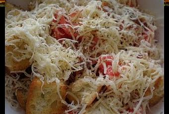 Ingredientes: 2-3 tomates maduros grandes, unas rebanadas de pan, media lata de anchoas, 4 dientes de ajo, aceite de oliva, sal, pimienta, albahaca, vinagre, queso curado rallado.Para preparar los picatostes cortamos groseramente las rebanadas de pan. Aliñamos los trozos con dos dientes de ajo bien picados, sal, pimienta y un chorrito de aceite. Removemos y metemos al horno unos 15 minutos, hasta que se doren los picatostes.