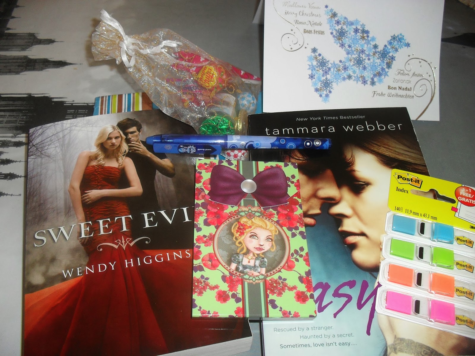 Lo primero que vi al abrir el paquete fueron dos libros envueltos en papel de regalo (sisi, DOS!). Los dos son libros que tenía muchísimas ganas de leer, pero sabía que por voluntad propia no me los iba a comprar, y estaban en mi wishlist desde hace un tiempo, así que decidí ponerlos en mi lista de Papá Noel. El primero es Sweet evil de Wendy Higgins y el segundo es Easy de Tammara Webber. Saray me pidió una reseña de cada uno, pero con la de libros y reseñas pendientes que tengo creo que dichas reseñas se van a tardar un poco :/ Pero juro solemnemente que las tendrás :D