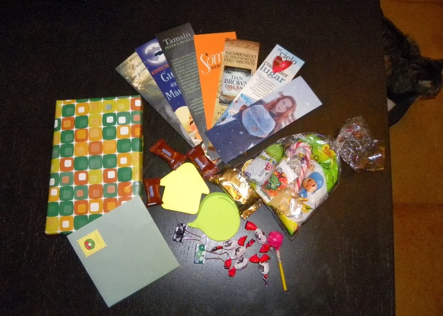 Pues como podéis ver había un montón de marcapáginas, unos post-its muy cucos, unos clips, caramelos, una bolsa con chuches y chocolates (de los cuales ya no queda ni rastro), una postal y el paquete que veis envuelto es el libro... pero, ¿cuál?