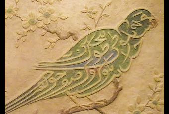 Relieve de caligrafía islámica en un papagallo. Pakistán, Lahore Museo Central. El desarrollo de la caligrafía como arte va ligado al hecho de que el islam prohíbe la adoración de representaciones figurativas y es así como la caligrafía ofrece en los lugares sagrados un sustituto a la decoración figurativa. En lugar de representar a Dios o al profeta, o cualquier otro motivo figurativo relacionado con la religión, el arte islámico los sustituye por la representación caligráfica de sus nombres, o por frases extraídas del Corán.