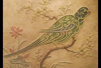Relieve de caligrafía islámica en un papagallo. Pakistán, Lahore Museo Central. El desarrollo de la caligrafía como arte va ligado al hecho de que el islam prohíbe la adoración de representaciones figurativas y es así como la caligrafía ofrece en los lugares sagrados un sustituto a la decoración figurativa. En lugar de representar a Dios o al profeta, o cualquier otro motivo figurativo relacionado con la religión, el arte islámico los sustituye por la representación caligráfica de sus nombres, o por frases extraídas del Corán.