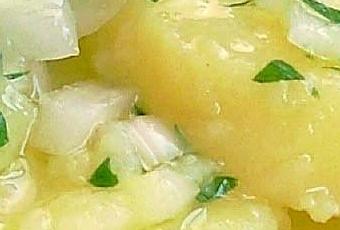 Picamos las cebolletas y el perejil y los añadimos a las patatas. Ponemos la sal gruesa, el vinagre y el aceite (por este orden). Removemos.