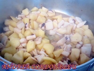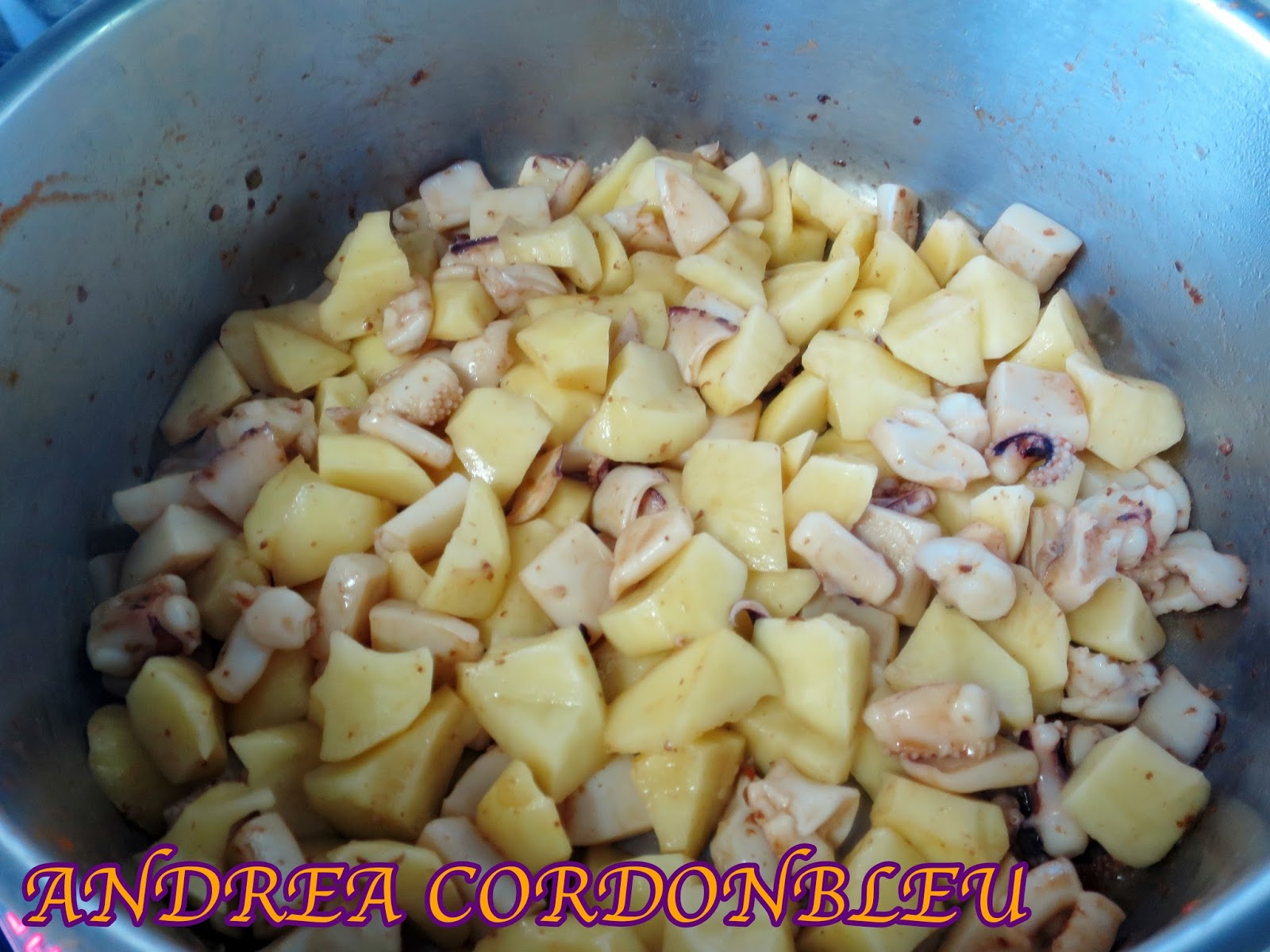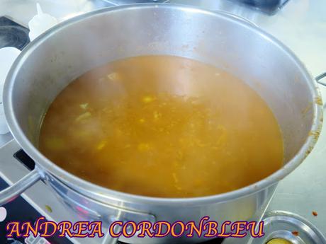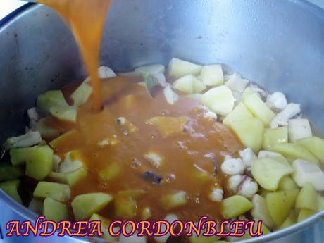 200 g de Chocos 600 g de Patatas100 g de Cebollas50 g de Pimientos verdes2 dientes de ajos 2 dl Aceite de oliva virgen extra 1 dl Vino blanco de calidad Pimienta Negra en Grano Laurel Sal común Azafrán Colorante amarillo 1,5 l Agua o Fumet ELABORACIÓN:Se preelabora el choco. Se corta en tacos gruesos.Se cortan las patatas encontradas (triscadas o crujida). Se corta la cebolla en juliana, el ajo en láminas y el pimiento en brounoise.Se dora el ajo, se agrega el pimiento y cebolla. Se rehogar bien. Se reserva y se tritura.